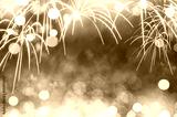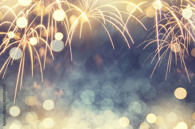 Gold and green Fireworks and bokeh in New Year eve and copy space. Abstract background holiday.