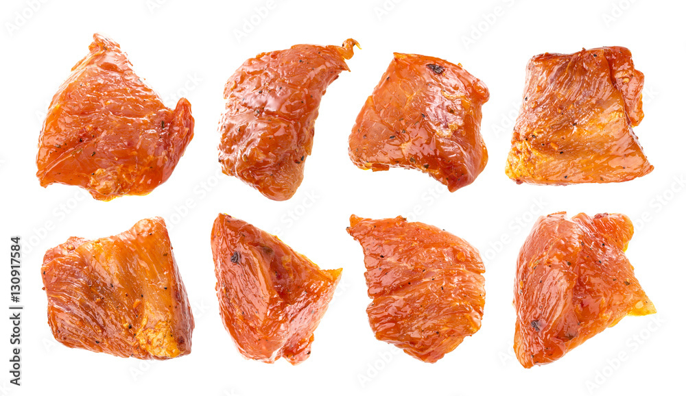 Chunks of raw pork shish kebab isolated on white background, with clipping path