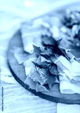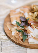 Prosciutto di Parma ham slices and fresh basil leaves on wooden board. Parma ham and basil.