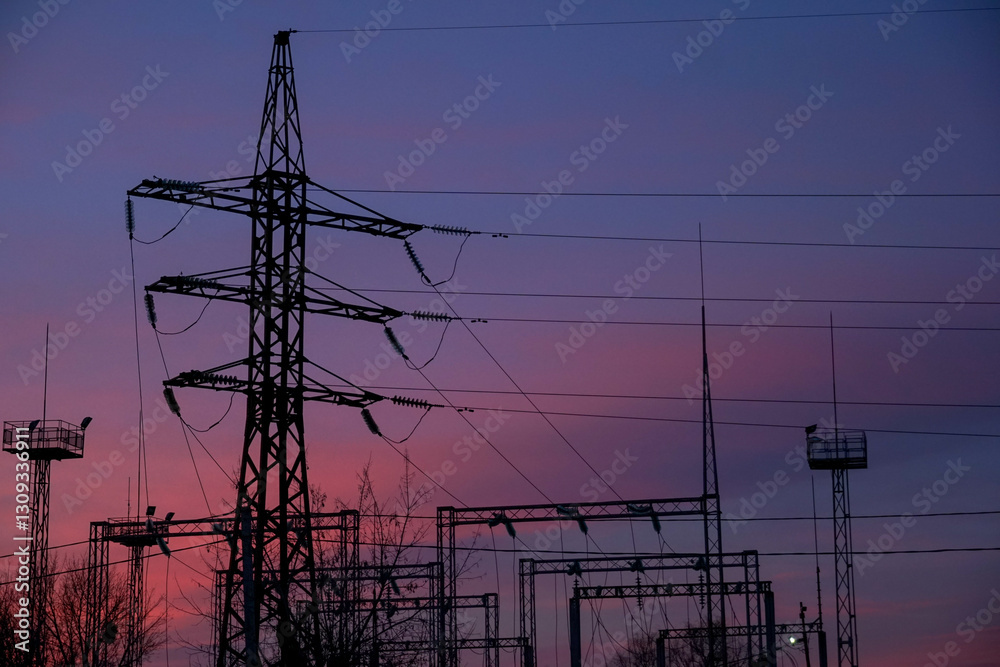 Power lines and towering structures create a striking silhouette against a colorful sunset sky in an energy facility during the evening hours