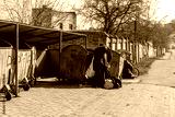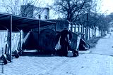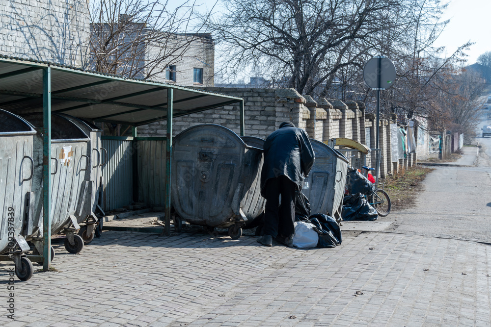 A person searches for items in large trash bins behind a building in an urban neighborhood under clear blue skies and bright sunlight