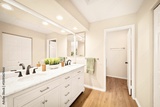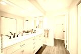 Bathroom scene with neutral tones, modern decor, soft lighting, and nice furnishings