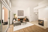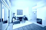 Home setting with neutral tones, large windows, modern decor, soft lighting, and cozy furnishings