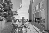 Outdoor patio with lush greenery, terracotta tiles, wicker furniture, and a cozy seating area