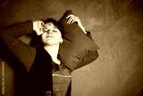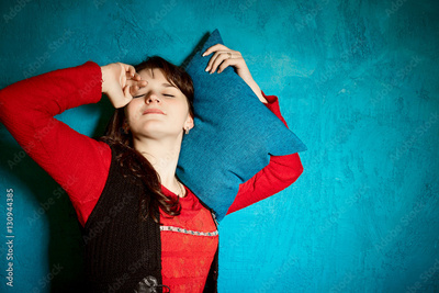 brunette woman in a red blouse leaning against a pillow in the blue wall and sleeps. Young woman sleeping on a pillow