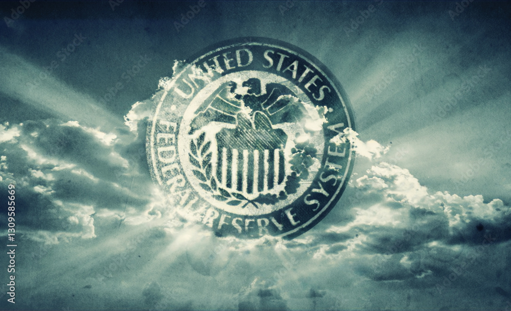Symbol of the US Federal Reserve System in the sun light. Concept and idea on the topic of finance, banks, politics, etc. Symbol of the prosperity or decline of the US financial system. Retro style.