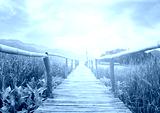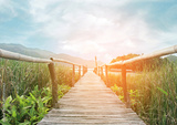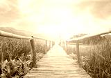 bamboo bridge walkway to lake on green field with burst sunrise