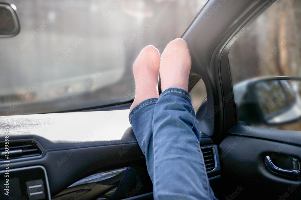 Jeans-clad legs on car dashboard, covered in cozy, light-colored socks. Forest setting with tall trees and diffused sunlight.