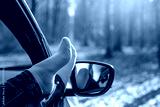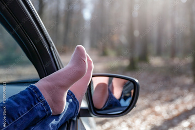 Feet wearing warm socks and legs in blue leggings sticking out of a car window in a forest in autumn setting.