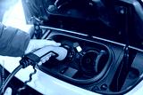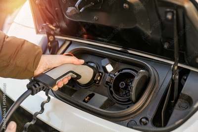 Close-up of an electric car's charging port with a hand plugging in a charging connector.