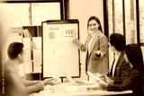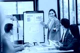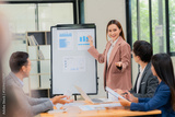 Motivated businessman leads a business meeting with the manager. Speech. Using television presentation with statistics. Using graphs and charts for effective strategies