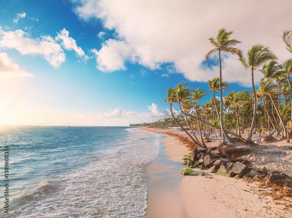 Tropical vacation summer beach shore with palm trees Dominican republic