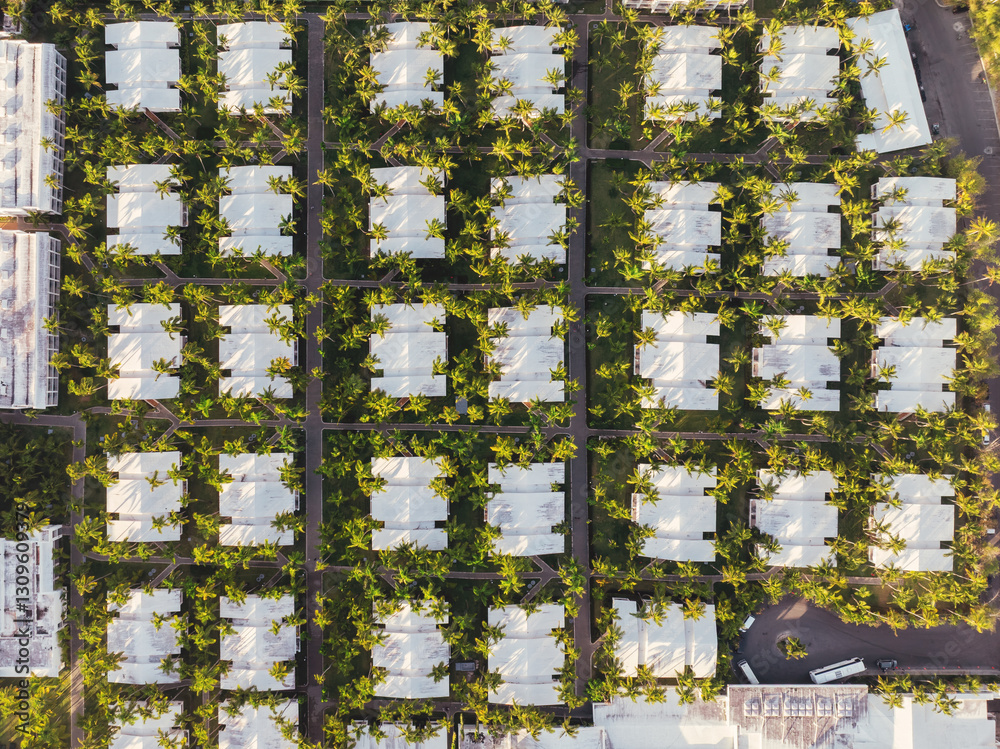 Aerial View of Modern Sustainable Housing Amid Lush Palm Greenery outdoor rental house architecture