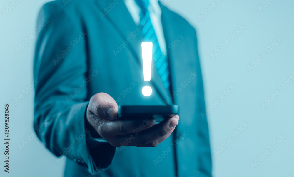 Businessman hand showing white exclamation mark. Error warning, notification, maintenance and troubleshooting.