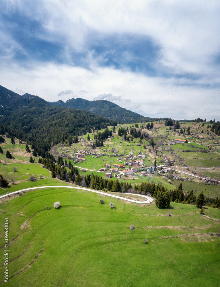 Sunny morning over the spring valley with rich vegetation, blossoming trees and houses scattered on the hills of the village of Gela near Smolyan, Rhodope Mountains, Bulgaria.