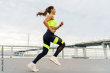 Woman runs energetically along a waterfront path with bridge in background on cloudy day
