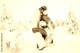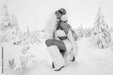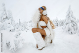 Luxury winter fashion. Elegant and sexy blonde model in white fur and fashionable white fur boots poses in snowy winter scenery. Woman in winter wonderland.