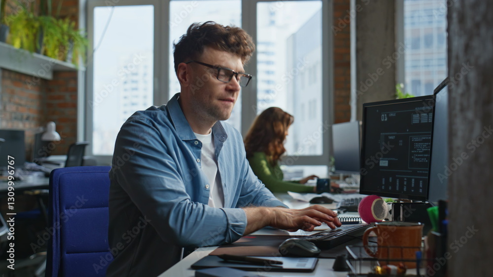 Smiling programmer coding keyboard drawing graphic tablet at office closeup