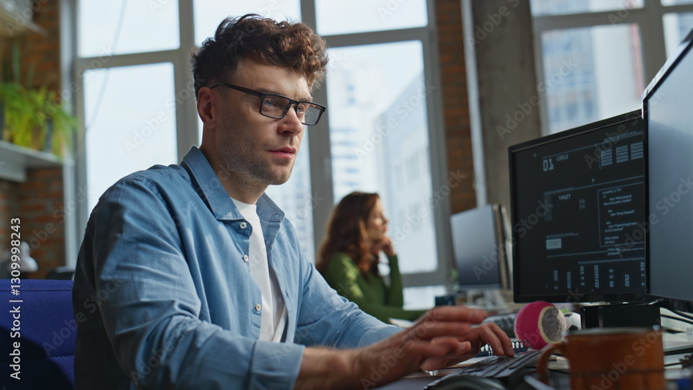 Eyeglasses developer typing keyboard writing code at office workplace closeup