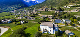 Switzerland travel, scenic places in Valais canton. Leuk town surrounded by vineyards and Alps mountains. Aerial drone panorama with medieval castles and village