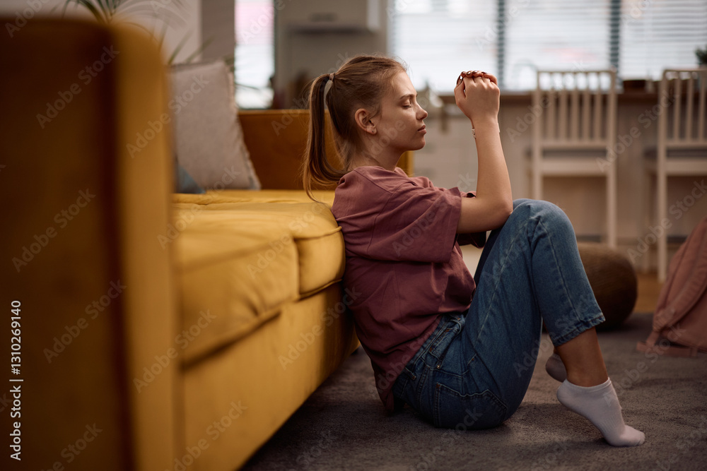 Displeased teenage girl with eyes closed sitting on floor at home.