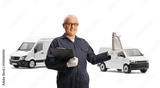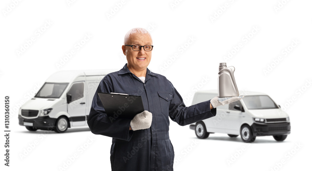 Auto mechanic holding an engine oil for vans and a clipboard