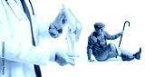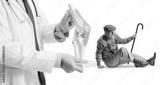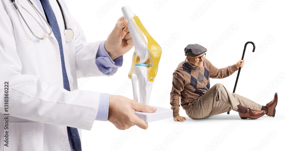 Elder with knee pain sitting on the ground and doctor holding a knee bone model