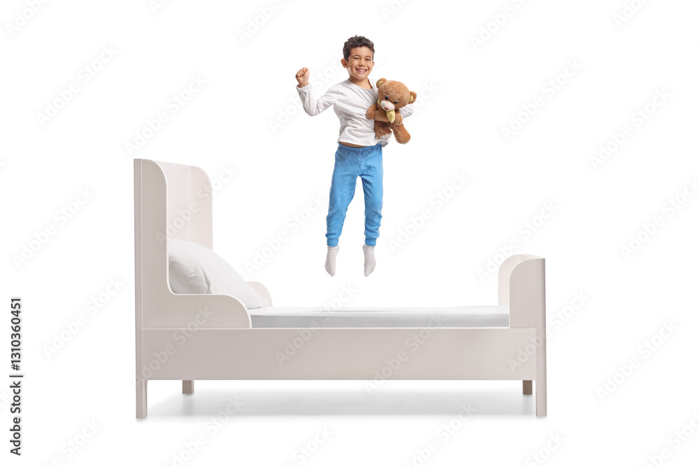 Boy in pajamas holding a teddy bear and jumping on a bed