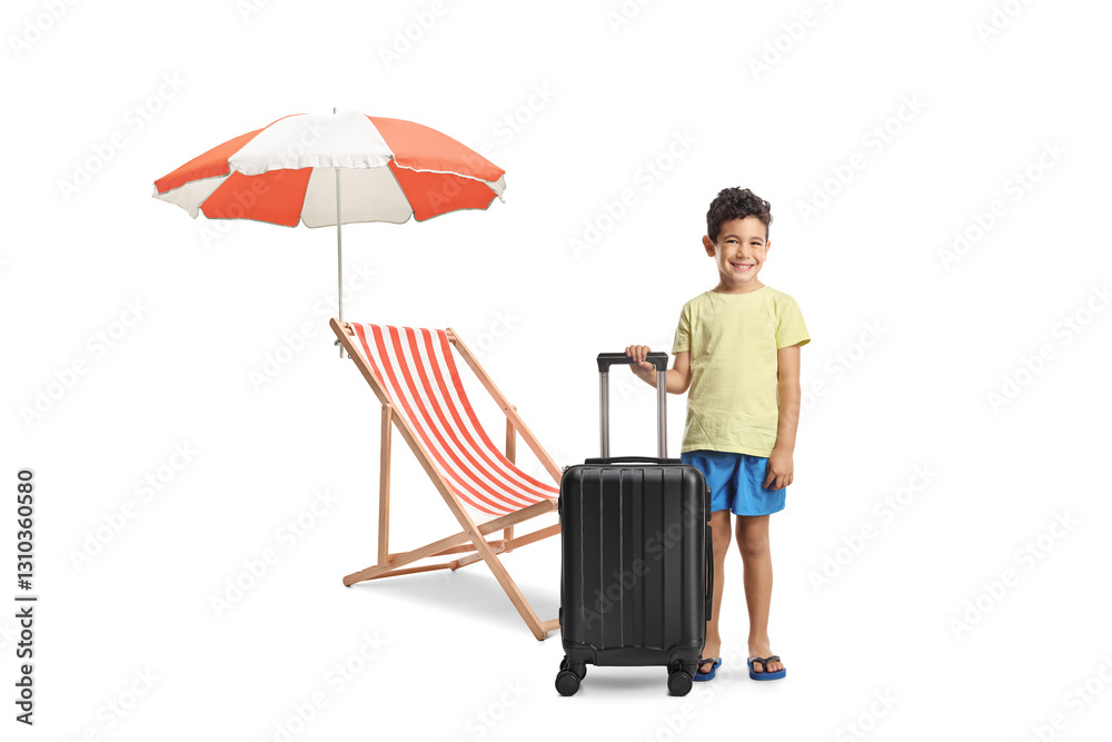 Little boy with a suitcase next to a beach chair and umbrella