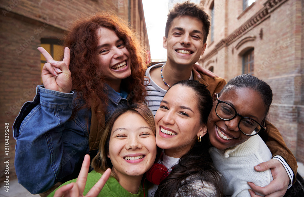 Group of multiethnic student friends taking a selfie together outdoors at university. Diverse people having fun using phone to take photos for social media.