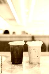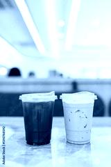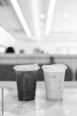 Two plastic cup of iced black coffee and iced coffee latte in coffee shop.