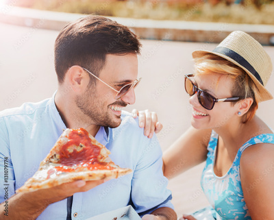 Couple eating pizza outdoors