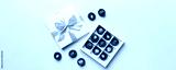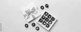 White box with chocolates candies and golden tape. top view with copy space