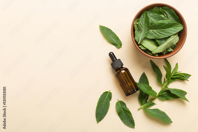 Natural Mint Essential Oil in a Glass Bottle. organic cosmetics with herbal extracts of mint on colored background