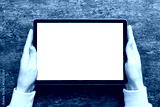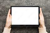 female teen hands using tablet pc with white screen, Mockup image of woman hand holding white tablet pc with blank white screen at home