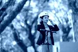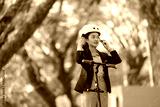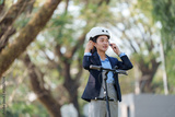 Young businesswoman wearing helmet, getting ready to ride electric scooter in park, promoting sustainable and eco-friendly transportation for commuters