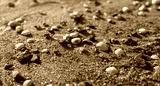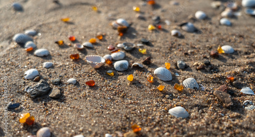Amber stones on sea coast. Amber gems search on Baltic sea shore, fossilized tree resin crystals on sand