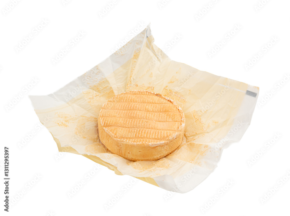 Munster cheese isolated, stinky french cheese, creamy dairy product, gourmet food, orange round cheese