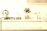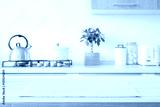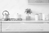 Beige woven rectangular placemat on wooden table top over blurred kitchen room gas stove counter background