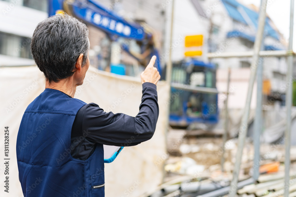 タブレット、建設、ゼネコン、工事、男性、工事現場、職人、大工、土木、設計、解体、建築、DX、デジタル、画面、労働者、作業員、建機、サブコン、確認、安全、点検、チェック、検査、親方、棟梁、足場、基礎、調査、データ、分析、日本人、シニア、技術、IoT、システム、アプリ、建物、監督、仕事、技術者、エンジニア、取り締り、働く、IIoT、管理、作業、施工、テック、人物