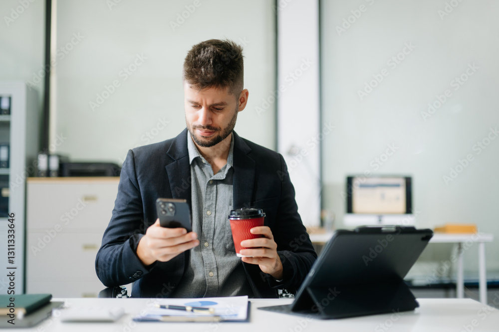Professional businessman working at office with laptop, tablet, and notes. Perfect for business, finance, accounting