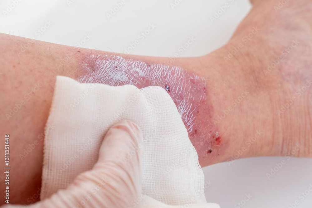 doctor applies ointment to wound from on lower leg with scars adult female patient, redness, sores on limbs, scarring skin, concept medical care, health care, human tissue regeneration