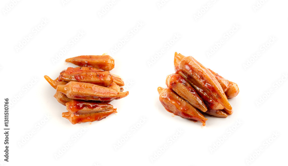 Stewed okra, cooked bamya fruits isolated, traditional asian dish bamia in red sauce, okra stew closeup