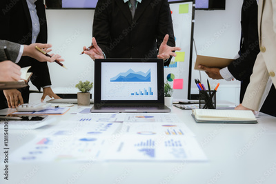 A team of professionals work together in an office to analyze financial charts, market strategies and work as a team to drive business growth and success.