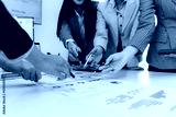 A team of professionals work together in an office to analyze financial charts, market strategies and work as a team to drive business growth and success.