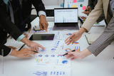 A team of professionals work together in an office to analyze financial charts, market strategies and work as a team to drive business growth and success.