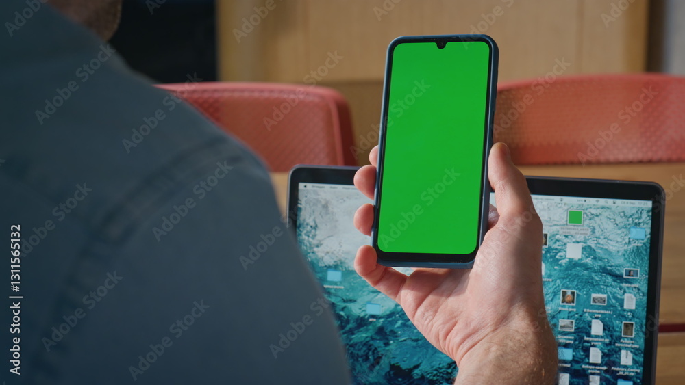 Man finger tapping mockup cellphone touching green screen at workplace closeup