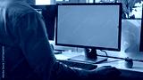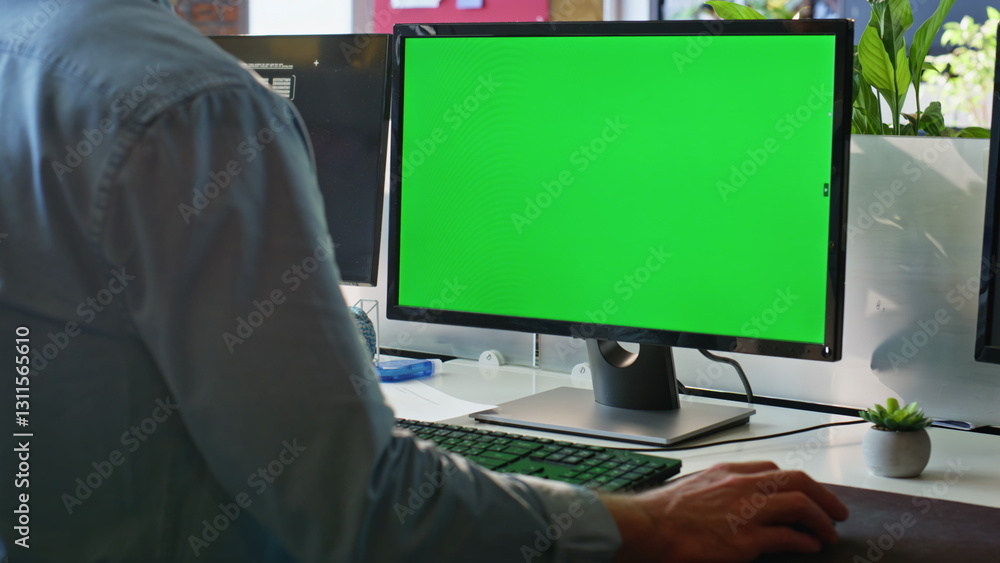 Unknown freelancer working green screen computer in modern workplace closeup