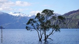 Wanaka tree growing in the middle of a lake with mountains in the background in lake Wanaka new Zealand