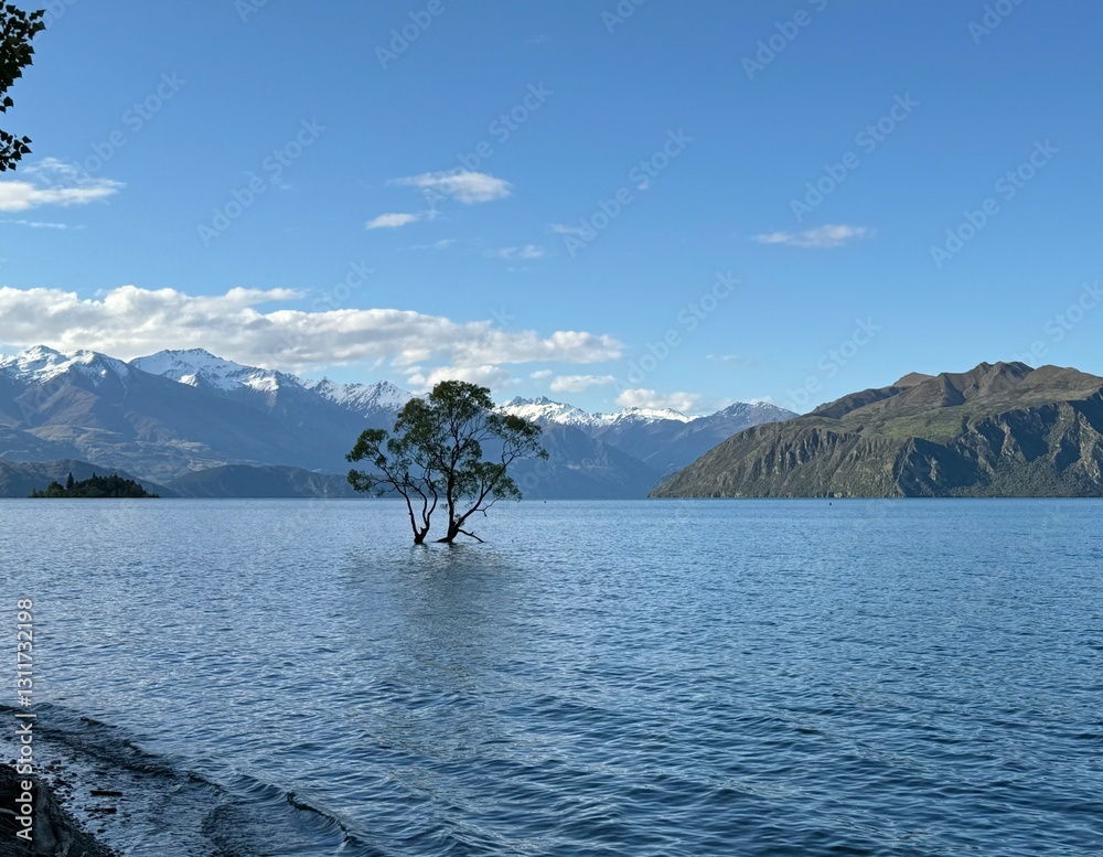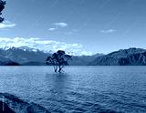 Wanaka tree growing in the middle of a lake with mountains in the background in lake Wanaka new Zealand